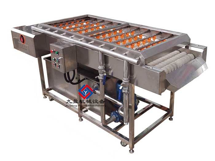 毛刷清洗機--主要有毛刷組、噴淋系統、水循環系統組成,機器根據物料種類及表面光滑程度,進行傾斜度的設計及毛刷種類、軟硬程度的選擇。毛刷有大毛刷、小毛刷、波浪式毛刷等,以適應不同物料的清洗??勺鲞m合:大棗、橄欖、胡蘿卜、土豆、蘋果、梨等物料清洗。